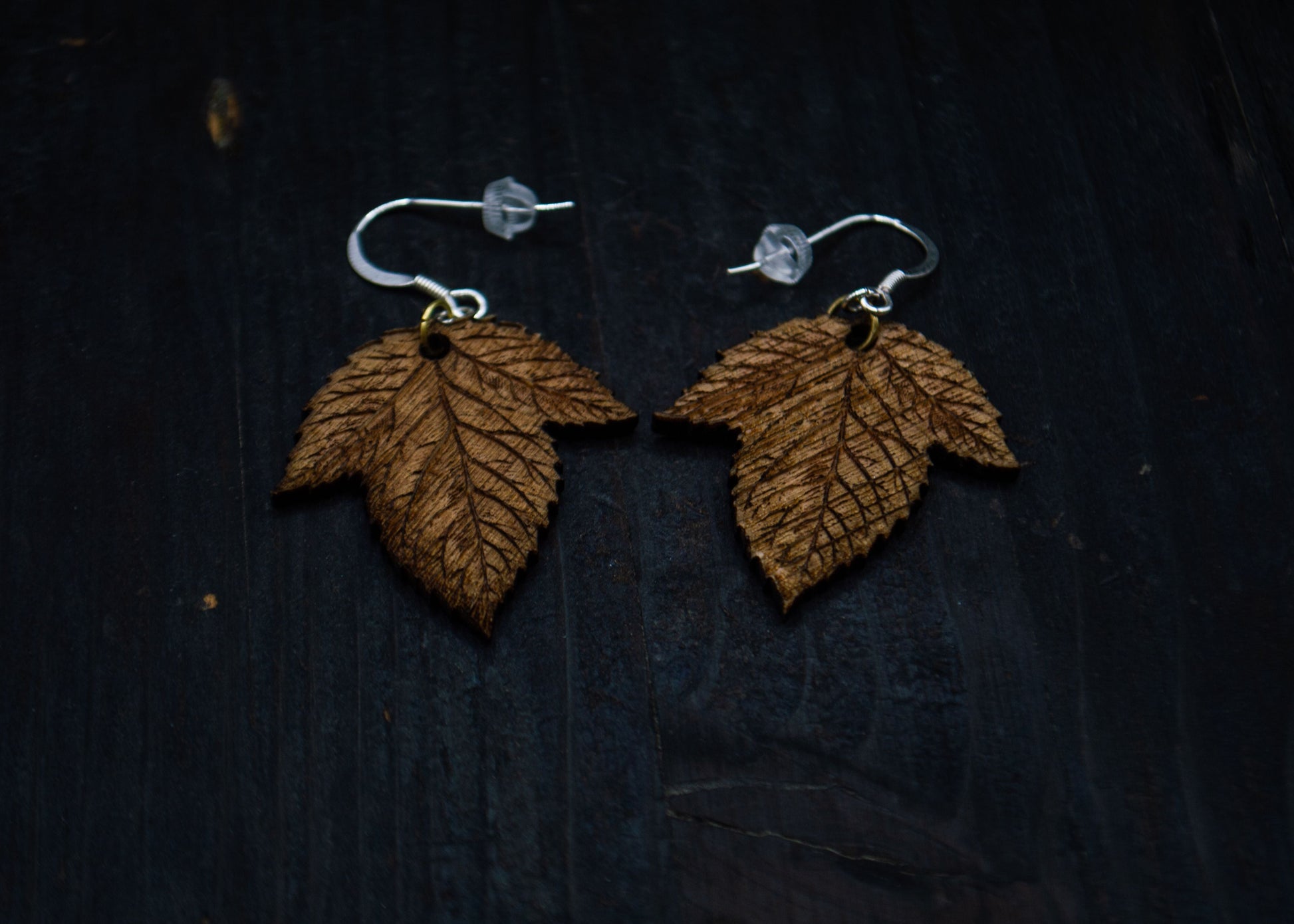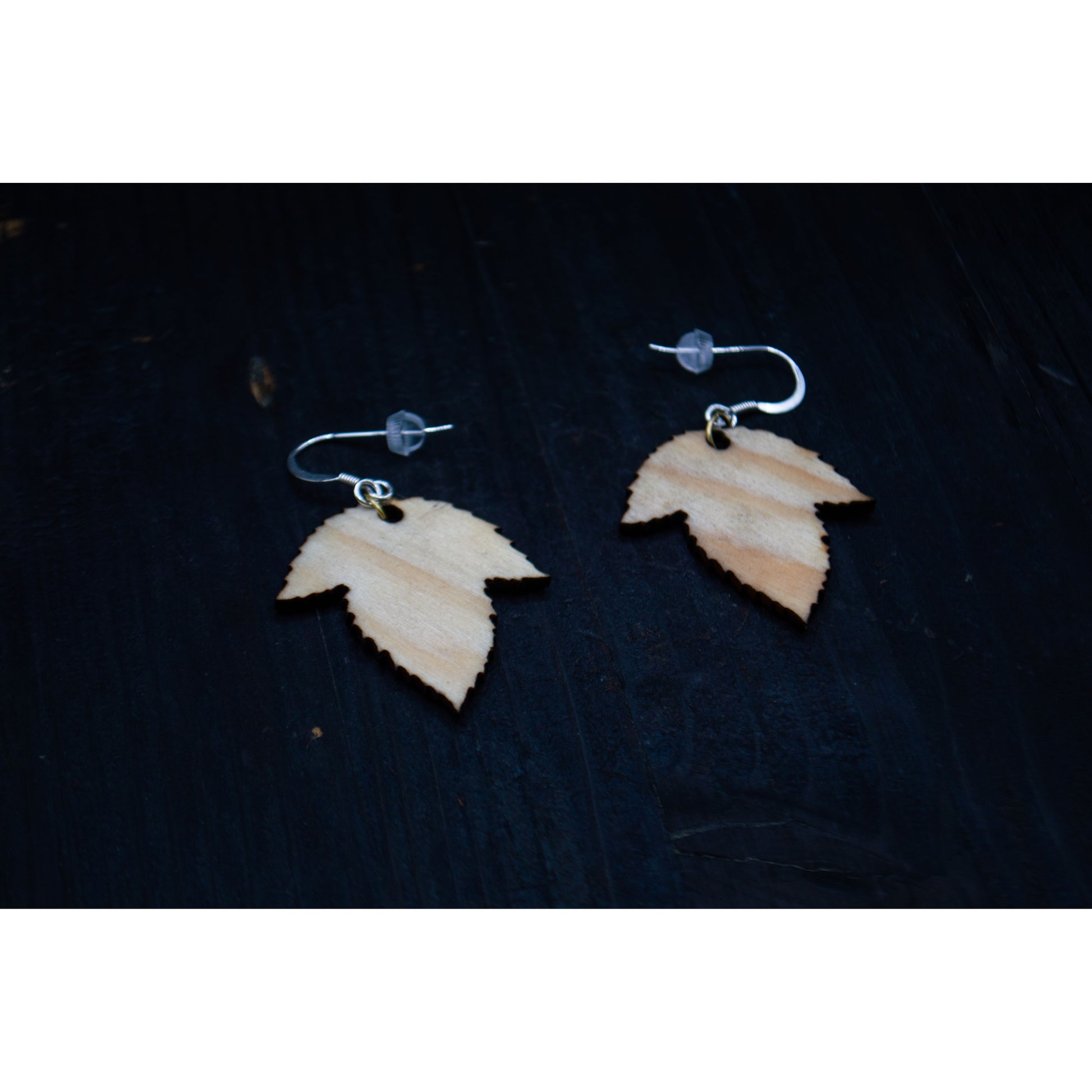 Laser‑cut earrings with silver hooks.